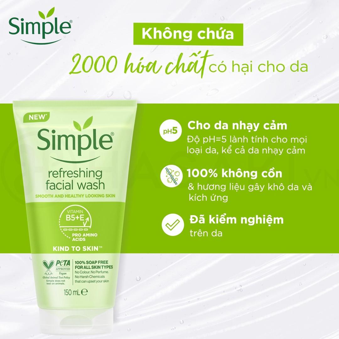 Với công thức 100% không chứa xà phòng cùng các thành phần siêu dưỡng da, Gel Rửa Mặt Simple Refreshing Facial Wash phù hợp sử dụng hàng ngày cho mọi loại da, ngay cả trên những làn da nhạy cảm nhất. Đồng thời, tương tự như các sản phẩm khác của Simple, Refreshing Facial Wash đã được kiểm nghiệm da liễu, không gây dị ứng, không chứa các hóa chất gây hại và không chứa cồn, dầu khoáng, màu nhân tạo, hương liệu.